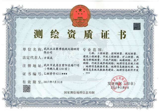 近日,经湖北省测绘地理信息局批准,永业行房产测绘资质升为乙级。本次资质升级工作于2014年底启动,与测绘资质复审换证同时进行。新的测绘资质内容中,房产测绘和地籍测绘合并为“不动产测绘”,专业范围包括地籍测绘、房产测绘、行政区域界线测绘。