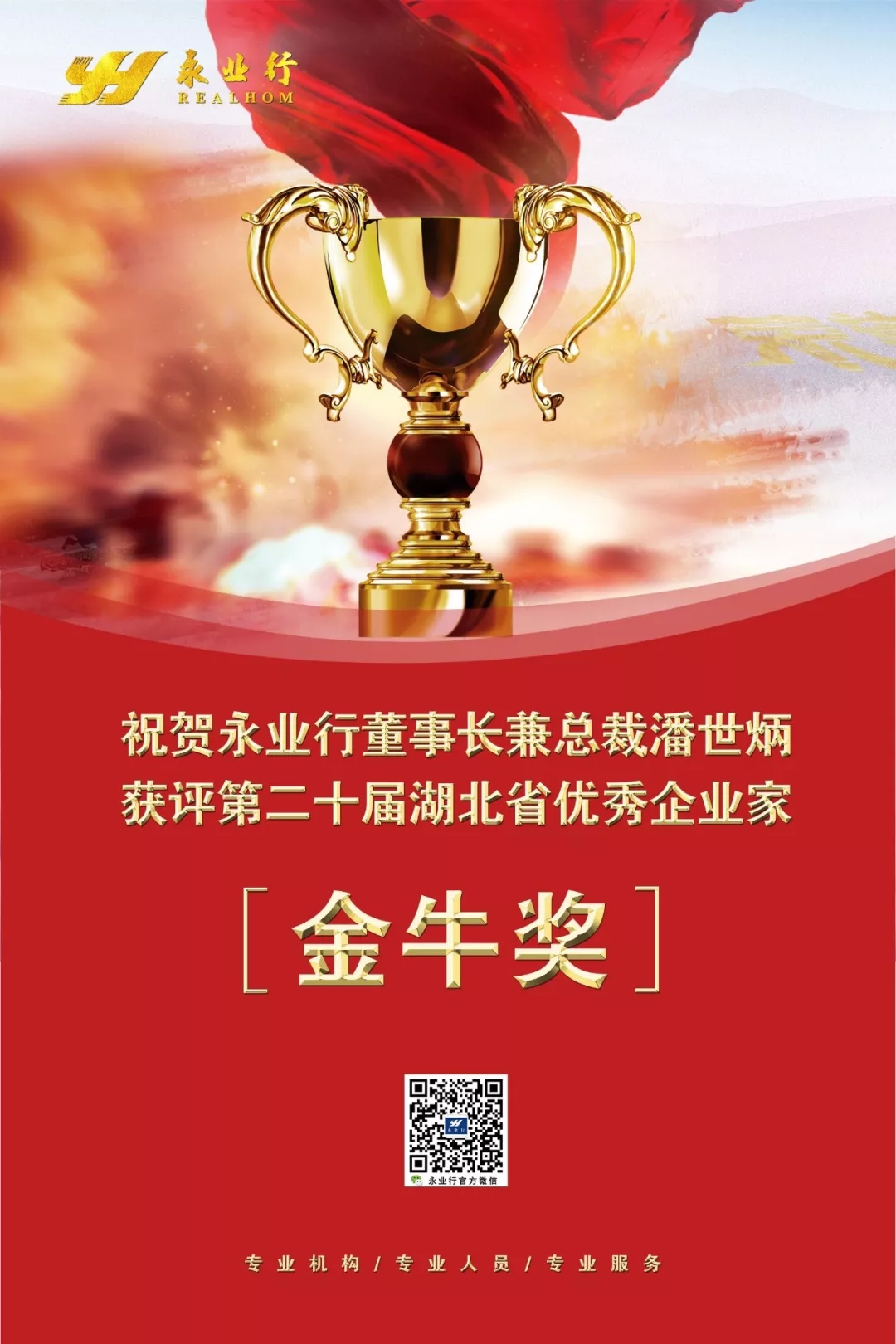 9月19日,第二十届湖北省优秀企业家(金牛奖)评选表彰名单揭晓,永业行董事长兼总裁潘世炳获评湖北省优秀企业家(金牛奖)称号。