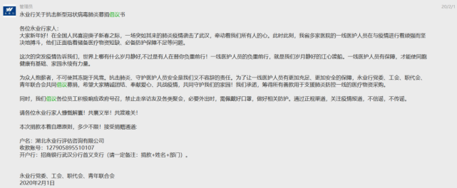 “为众人抱薪者,不可使其冻毙于风雪。抗击肺炎、守护医护人员安全是我们义不容辞的责任。为了让一线医护人员有更加充足、更加安全的保障,永业行党委、工会、职代会、青年联合会共同倡议募捐,希望大家精诚团结、奉献爱心、共战疫情,共同守护我们的家园!”2月1日,一封募捐倡议在永业行工作群内发布。潘世炳带头捐款,全体党员和各地员工也迅速响应,不到48小时,收到约700名员工共计20余万元捐款。截至2月17日,永业行及千余名员工累计筹得善款近40万元,陆续汇入武昌区慈善总会等慈善机构,期望通过点滴爱心,为战胜疫情尽永业行绵薄之力。
