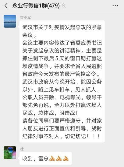 1月23日,腊月二十九日。凌晨两点,一条前所未有的通告,让潘世炳一夜未眠。“从23日10时起,暂时关闭室内公共交通以及航空和铁路的离汉通道。”这条信息让潘世炳意识到,这场没有硝烟的“战争”正在全面升级。天一亮,他便召集永业行高管召开视频会议,亲自担任疫情防控工作领导小组组长,围绕抗疫捐助、疫情防控、员工健康监测、信息排摸、工资发放及困难员工救助等进行专题研究。23日下午4时,永业行捐赠的10万元新冠肺炎疫情防控专款转入武汉市青少年发展基金会账户,成为疫情发生后国内首家捐赠的专业服务机构,多家媒体宣传报道。