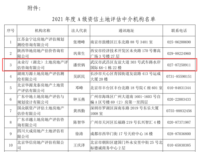 近日, 中国土地估价师与土地登记代理人协会(下称“中估协”)发布“2021年度A级资信土地评估中介机构”名单,永业行再次入选,连续13年获得“A级资信土地评估中介机构”称号。