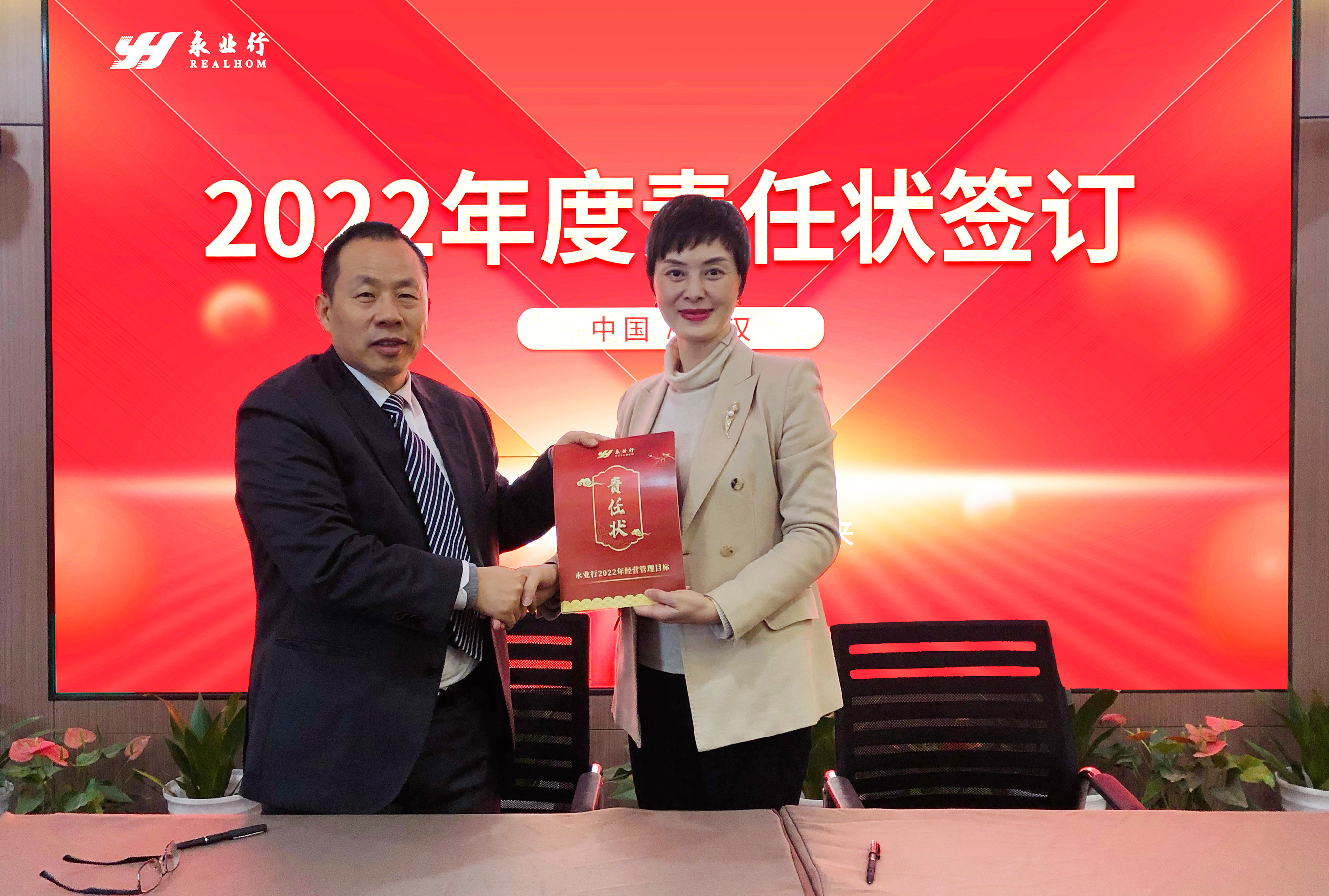 会上,潘世炳、王琴与高管及部门负责人签订了《2022年经营管理目标责任状》。