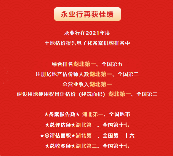 2022年4月1日,中国土地估价师与土地登记代理人协会发布《关于2021年度土地估价报告电子化备案排名结果的公告》,永业行公司综合排名湖北第一、全国第五!备案报告数方面,永业行排名湖北第一、全国第十;备案总评估额方面,永业行排名湖北第一、全国第十七;总评估面积方面,永业行排名湖北第二、全国第二十六;总收费额方面,永业行排名湖北第二、全国第十七。