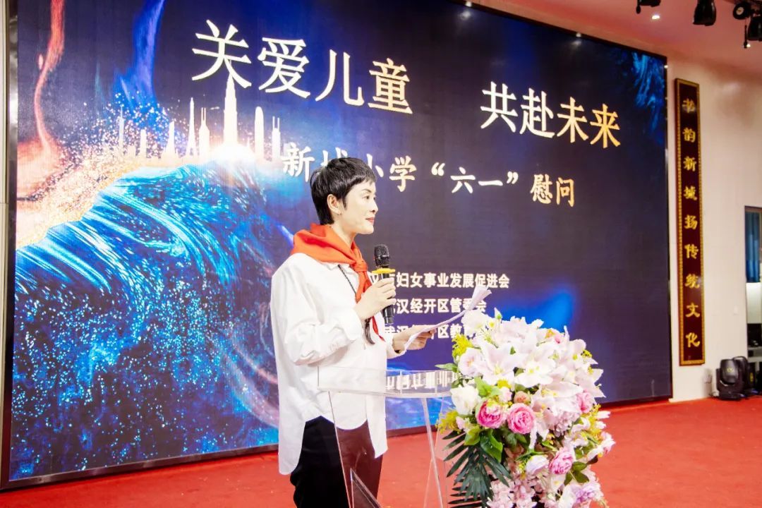武汉经开区教育局党委书记、局长熊白莉上台致辞。她指出,武汉市妇女事业发展促进会与各位市老领导来到经开区新城小学开展捐赠慰问活动,充分展现了对经开区教育工作的厚爱和对孩子们健康成长的期望。希望新城小学以此次活动为新起点,落实好立德树人根本任务,继续秉承“快乐童年 多彩人生”的办学理念,用好捐赠的教育资源,将足球这一办学特色发扬光大,用优秀的办学成果回馈各级领导和社会各界的关心支持。