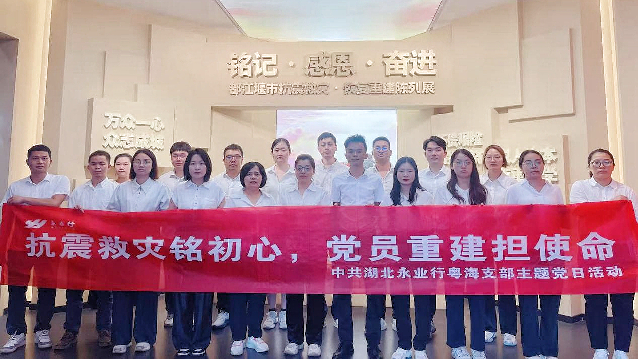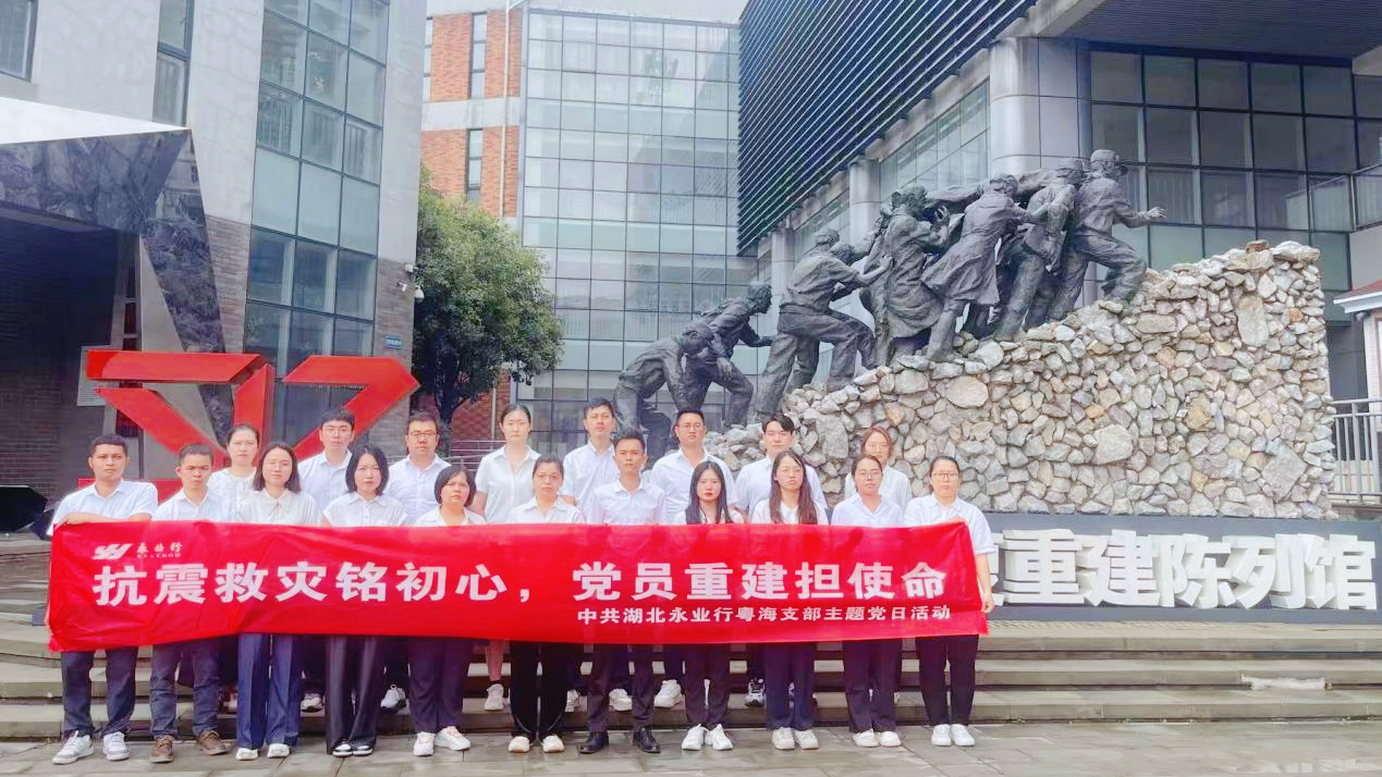 2025年6月22日,中共湖北永业行粤海支部委员会书记周攀带领支部全体党员、入党积极分子及员工赴都江堰市抗震救灾和恢复重建陈列馆,开展“抗震救灾铭初心 党员重建担使命”主题党日活动,感悟“万众一心、众志成城,不畏艰险、百折不挠,以人为本、尊重科学”的抗震救灾精神,强化党员责任担当。