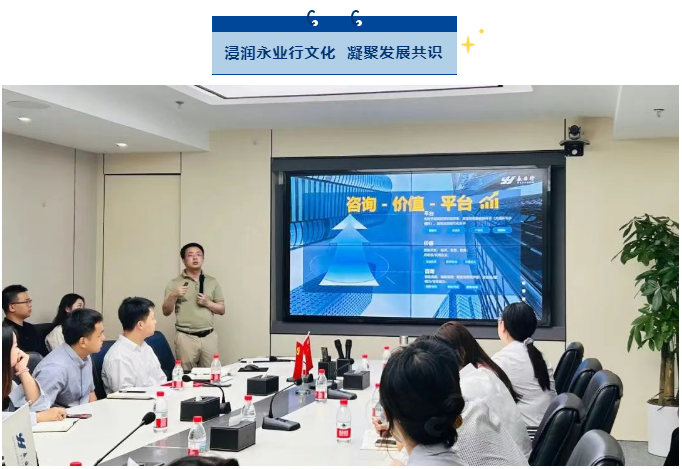 在培训中,永业行高级副总裁文云波为员工作《咨询价值与平台升级》主题分享,从国内国际宏观形势引入,深入剖析咨询行业市场定位、服务内容和核心价值,向员工介绍了公司的发展愿景、战略目标和业务定位,深入阐述了“咨询”的核心理念和价值观,并以实践和案例展示了平台的价值、咨询行业发展前景,以产业链的业务发展和融合为指引,为新员工未来专业能力提升、职业规划指出了明确的发展方向。他对新员工的加入表示热烈欢迎,并鼓励他们以专业创造价值,用智慧服务发展,为永业行做大做强民族高端咨询服务业贡献青春力量。