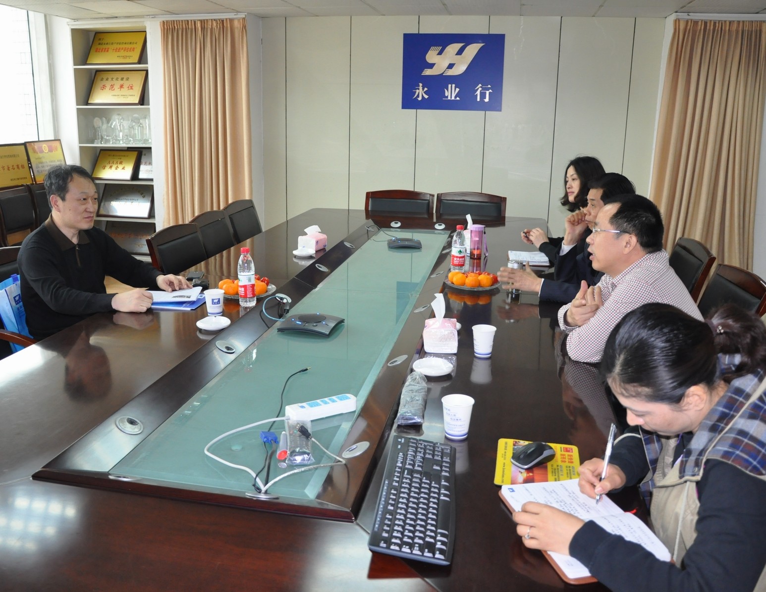 公司董事长方国成、总裁潘世炳、副总裁王琴、综合部负责人杨雪莲等热情接待了孙编委。潘总介绍了公司基本概况、发展思路及规范管理措施等;孙编委对永业行的发展现状及管理模式等予以了充分肯定,并对永业行的发展前景寄予期望;大家就有关行业发展问题进行了交流、探讨。