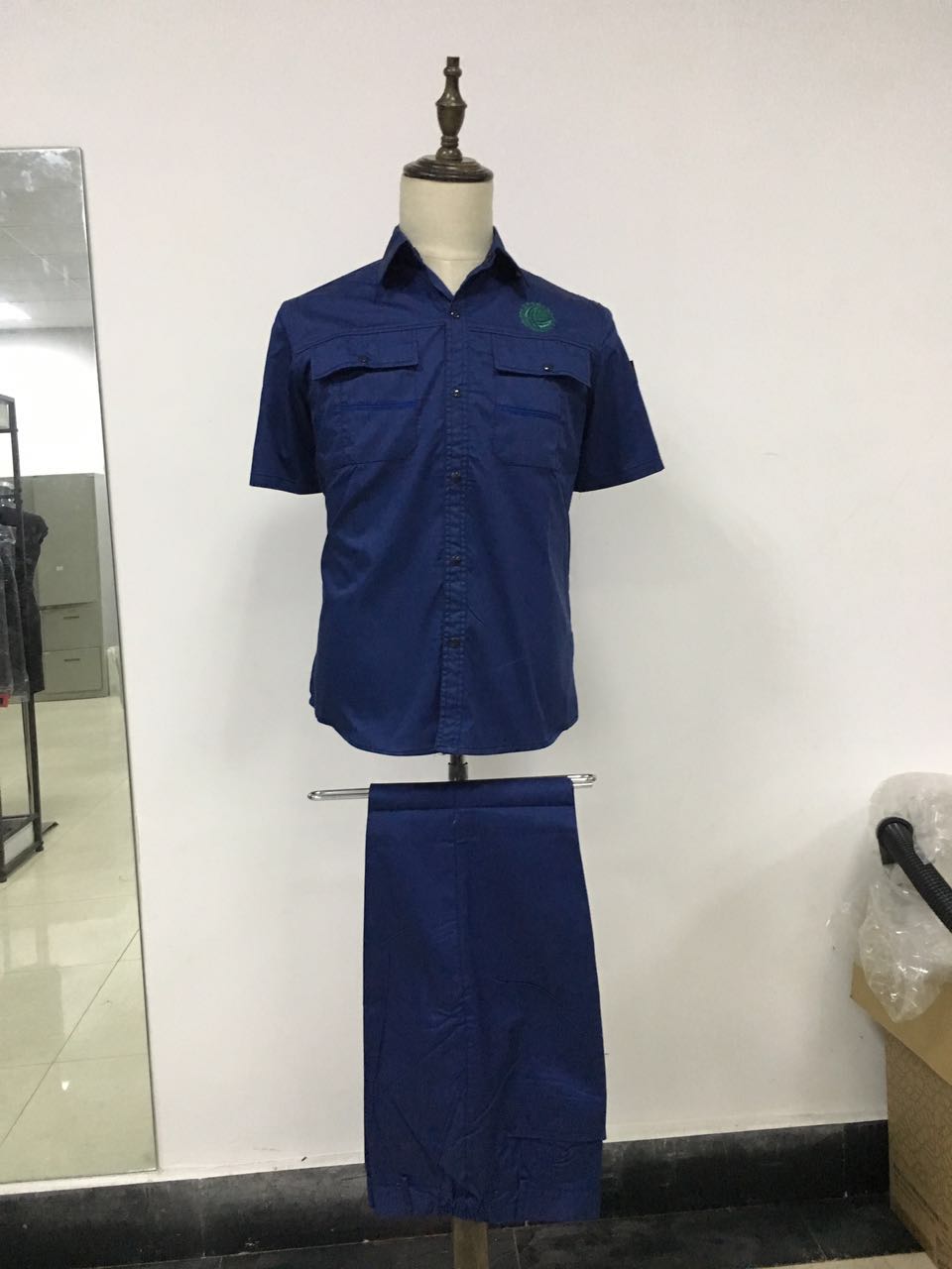 此款工作服货号是AD10-1,采用环保面料,融进时尚的设计理念,工作服进行生活化,全新打造一款员工上下班都能穿、喜欢穿的工作服。平整的工艺走线,版型的挺括,深受贺经理以及公司领导的青睐。相信穿着这样的工作服出去抄电表,展示不一样的员工风采。