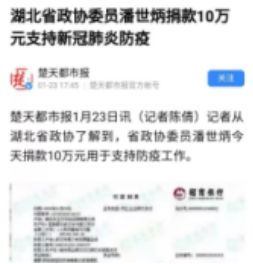 1月26日,潘世炳以湖北省房地产业协会会长、省新联会副会长兼社会组织分会会长身份,向行业同仁发起倡议,号召广大会员捐款捐物,向社会各界征集防护物资采购渠道。业内企业、有关社会组织同声响应,慷慨解囊,捐款捐物(含总部)总额超过10亿元,捐赠各类医护用品等价值2491万元。